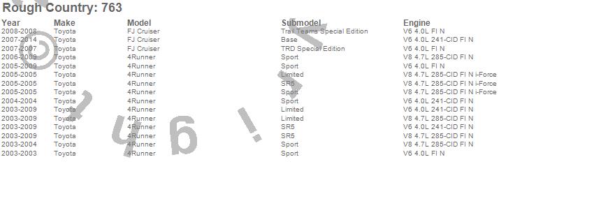 Below is an abbreviated list of applications for the Suspension Lift Kit.4Runner, FJ Cruiser, Toyota, 2014, 2013, 2012, 2011, 2010, 2009, 2008, 2007, 2006, 2005, 2004, 2003