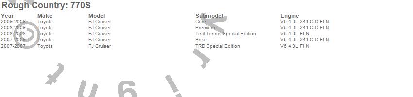 Below is an abbreviated list of applications for the Suspension Lift Kit w/Shocks.FJ Cruiser, Toyota, 2009, 2008, 2007