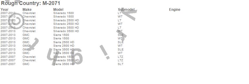Brand: Rough CountryPart Number: M-2071Floor Mat Set Type: Front - 2 pc.UPC: 843030117948