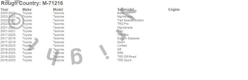 Below is an abbreviated list of applications for the Heavy Duty Floor Mats.Tacoma, Toyota, 2023, 2022, 2021, 2020, 2019, 2018, 2017, 2016