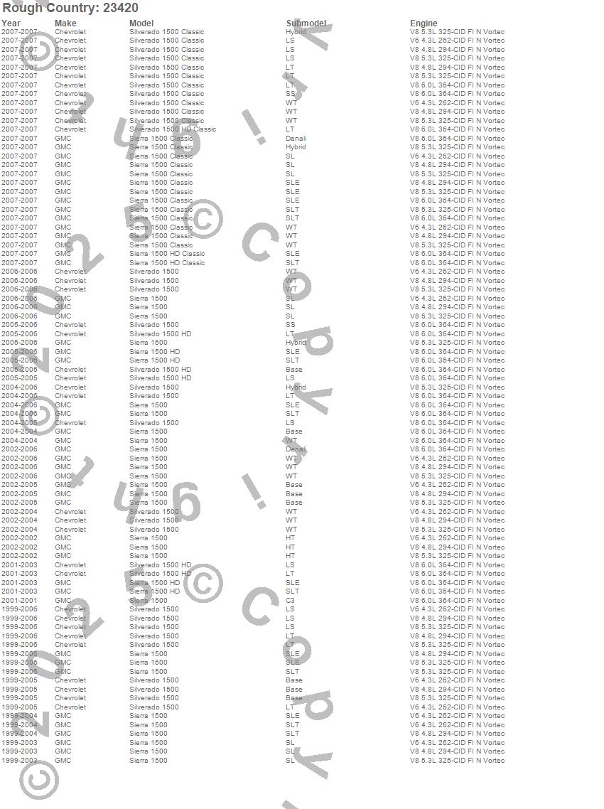 Below is an abbreviated list of applications for the Suspension Lift Kit w/Shock.Sierra 1500, Sierra 1500 Classic, Sierra 1500 HD, Sierra 1500 HD Classic, Silverado 1500, Silverado 1500 Classic, Silverado 1500 HD, Silverado 1500 HD Classic, Chevrolet, GMC, 2007, 2006, 2005, 2004, 2003, 2002, 2001, 2000, 1999