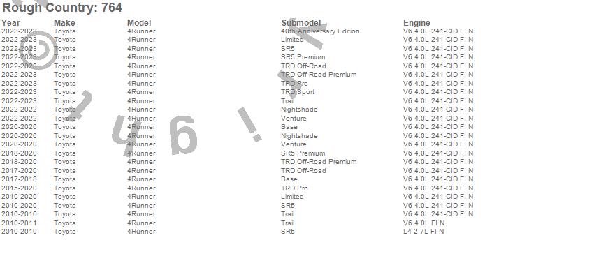 Below is an abbreviated list of applications for the Suspension Lift Kit.4Runner, Toyota, 2024, 2023, 2022, 2020, 2019, 2018, 2017, 2016, 2015, 2014, 2013, 2012, 2011, 2010