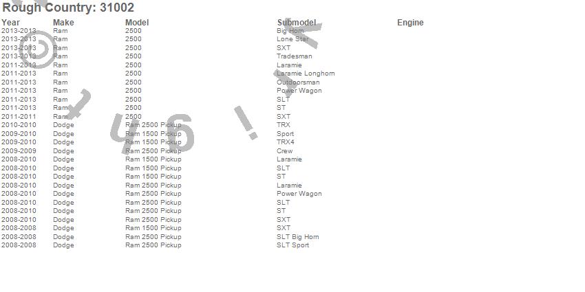 Brand: Rough CountryPart Number: 31002Track Bar Bracket Type: Front - For Models w/2-3 in. Lift - Incl. HardwareUPC: 843030142056