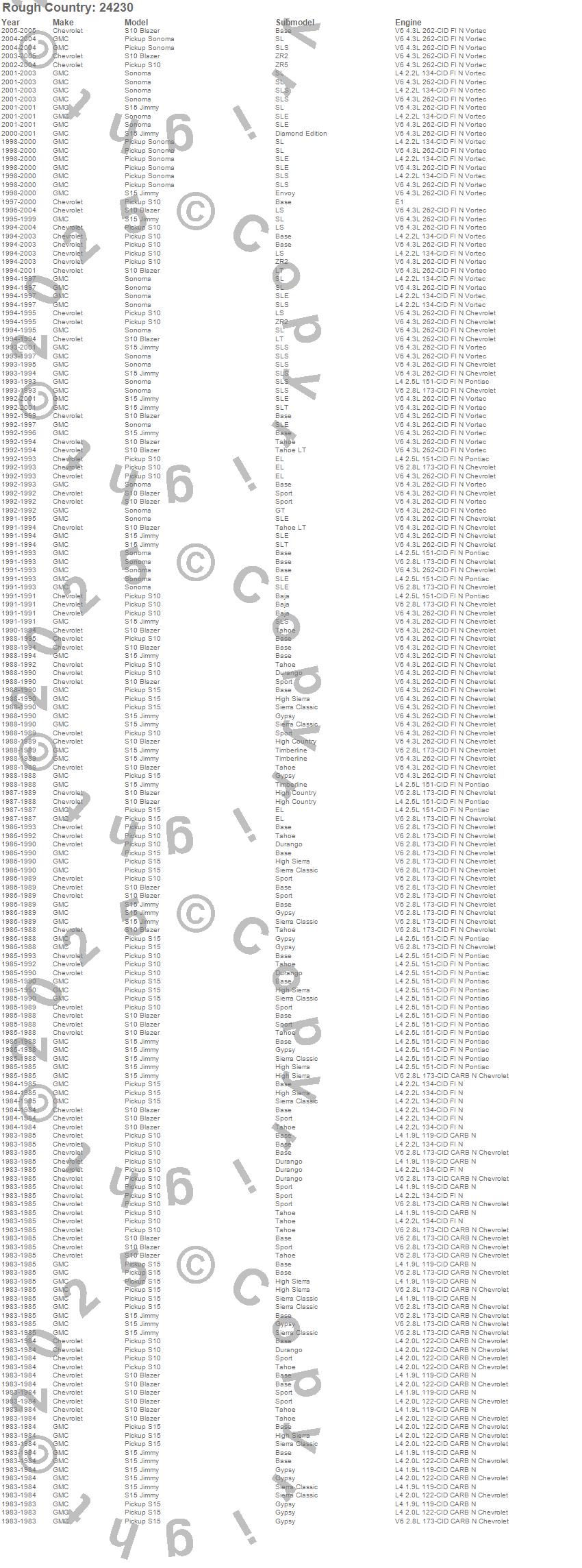 Below is an abbreviated list of applications for the Suspension Lift Kit w/Shocks.S10 Blazer, S10 Pickup, S15 Jimmy, S15 Pickup, Sonoma, Chevrolet, GMC, 2005, 2004, 2003, 2002, 2001, 2000, 1999, 1998, 1997, 1996, 1995, 1994, 1993