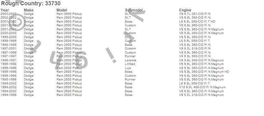 Below is an abbreviated list of applications for the Leveling Lift Kit.Ram 2500, Dodge, 2002, 2001, 2000, 1999, 1998, 1997, 1996, 1995, 1994
