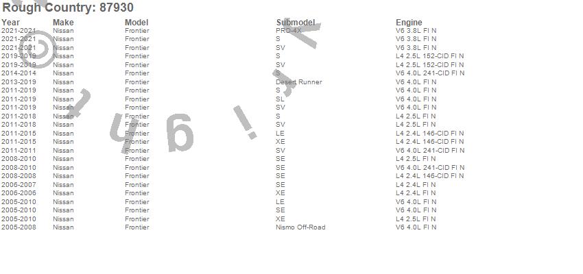 Below is an abbreviated list of applications for the Suspension Lift Kit w/Shocks.Frontier, Nissan, 2021, 2019, 2018, 2017, 2016, 2015, 2014, 2013, 2012, 2011, 2010, 2009, 2008, 2007, 2006, 2005