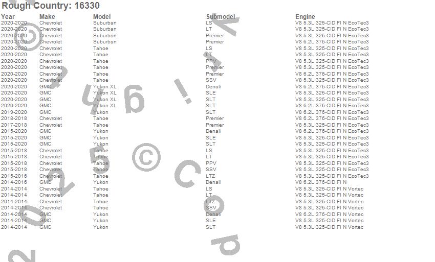 Below is an abbreviated list of applications for the Suspension Lift Kit.Suburban, Tahoe, Yukon, Yukon XL, Chevrolet, GMC, 2020, 2019, 2018, 2017, 2016, 2015, 2014