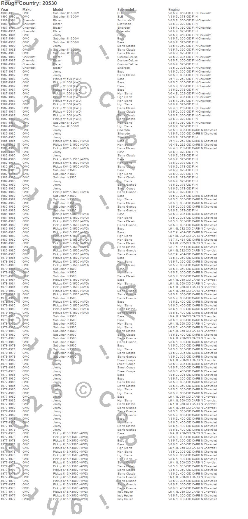 Below is an abbreviated list of applications for the Suspension Lift Kit w/Shocks.Blazer, Jimmy, K1500 Pickup, K1500 Suburban, V1500 Pickup, V1500 Suburban, Chevrolet, GMC, 1991, 1990, 1989, 1988, 1987, 1986, 1985, 1984, 1983, 1982, 1981, 1980