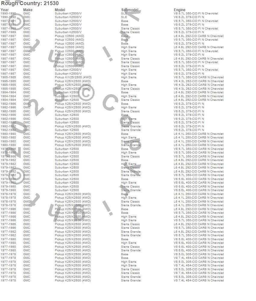 Below is an abbreviated list of applications for the Suspension Lift Kit w/Shocks.K25 Pickup, K2500 Pickup, K2500 Suburban, V2500 Pickup, V2500 Suburban, GMC, 1991, 1990, 1989, 1988, 1987, 1986, 1985, 1984, 1983, 1982, 1981, 1980, 1979, 1978