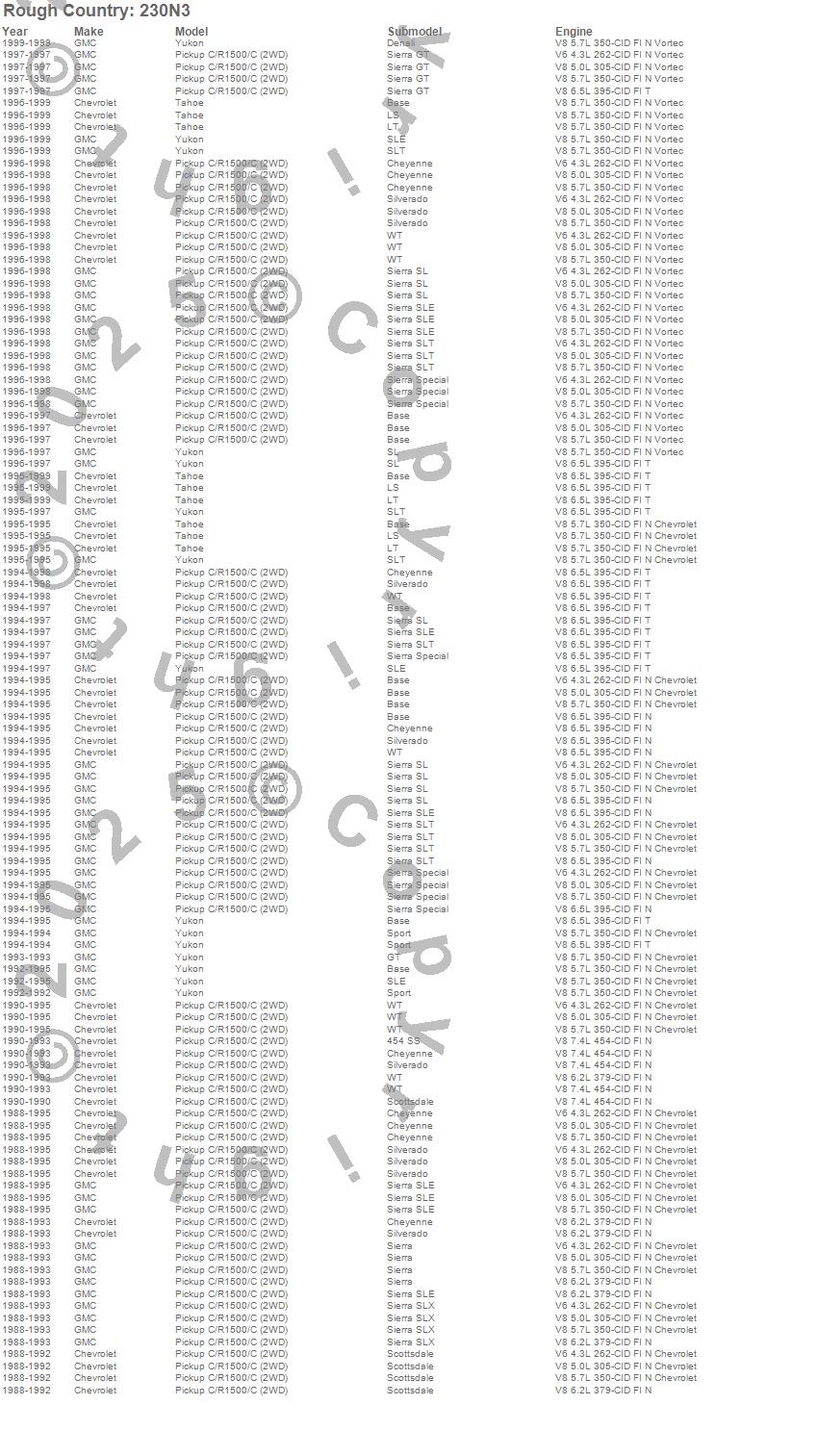 Below is an abbreviated list of applications for the Suspension Lift Kit w/Shocks.C1500 Pickup, Tahoe, Yukon, Chevrolet, GMC, 1999, 1998, 1997, 1996, 1995, 1994, 1993, 1992, 1991, 1990, 1989, 1988
