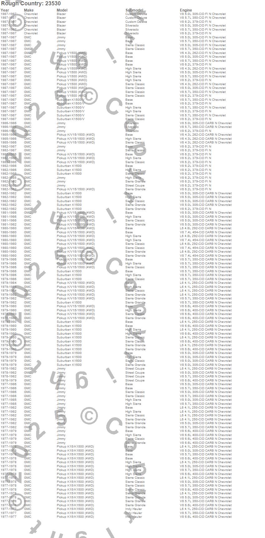 Below is an abbreviated list of applications for the Suspension Lift Kit w/Shocks.Blazer, Jimmy, K1500 Pickup, K1500 Suburban, V1500 Pickup, V1500 Suburban, Chevrolet, GMC, 1987, 1986, 1985, 1984, 1983, 1982, 1981, 1980, 1979, 1978, 1977