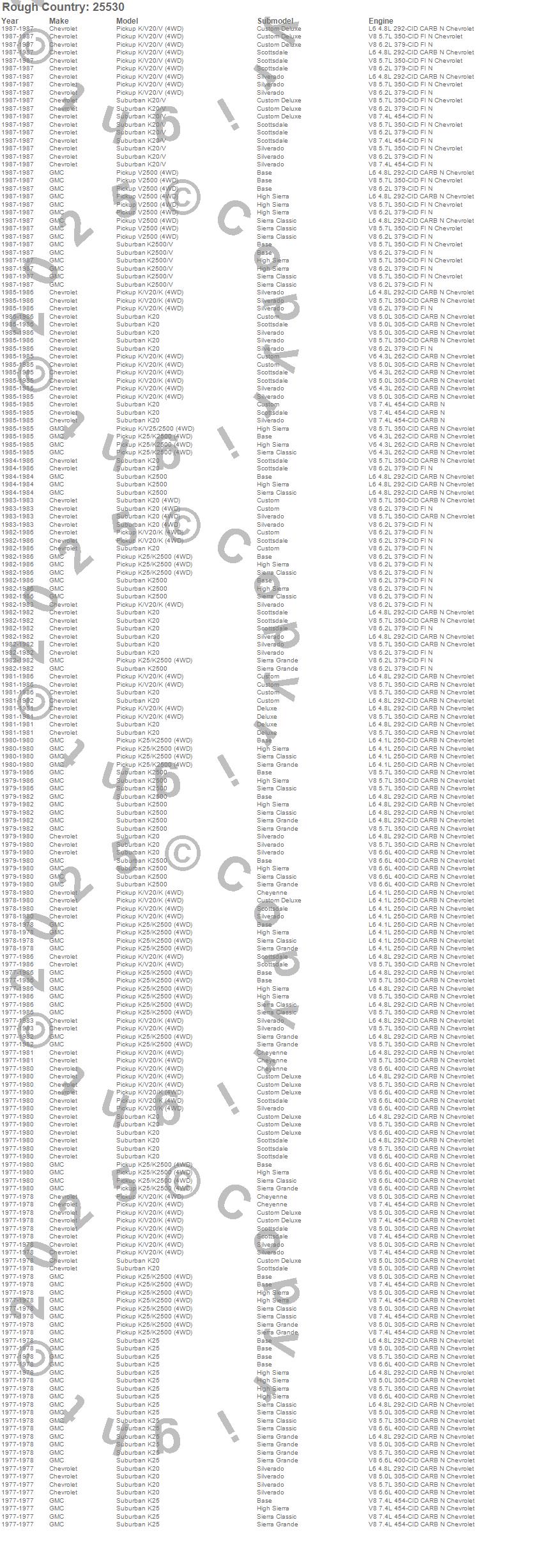 Below is an abbreviated list of applications for the Suspension Lift Kit w/Shocks.K20 Pickup, K20 Suburban, K25 Pickup, K25 Suburban, K2500 Pickup, K2500 Suburban, V20 Pickup, V20 Suburban, V2500 Pickup, V2500 Suburban, Chevrolet, GMC, 1987, 1986, 1985, 1984, 1983, 1982, 1981, 1980