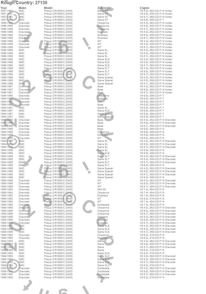 Brand: Rough CountryPart Number: 27130Lift Kit-Suspension w/Shock Type: 6 in. Lift - Incl. Spindles - Lift Blocks - Coil Springs - U-Bolts - Hardware - Front and Rear Premium N3 ShocksUPC: 843030150501