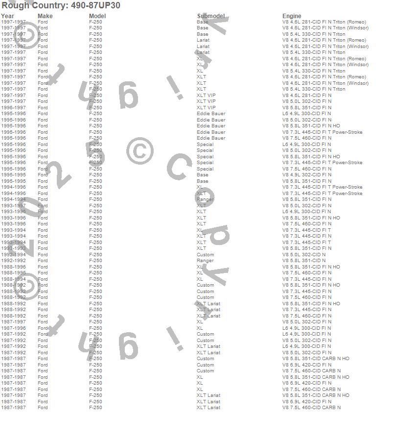 Below is an abbreviated list of applications for the Suspension Lift Kit w/Shocks.F-250, Ford, 1997, 1996, 1995, 1994, 1993, 1992, 1991, 1990, 1989, 1988, 1987