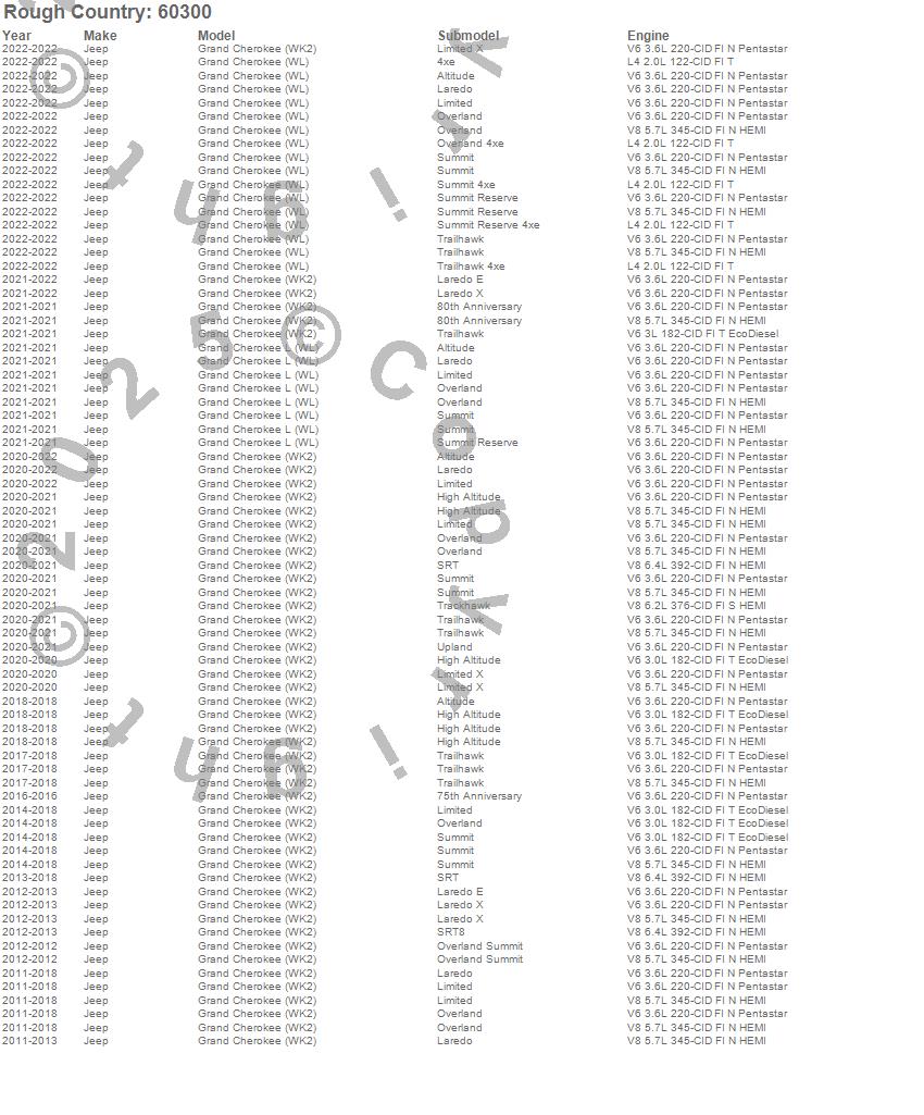Below is an abbreviated list of applications for the Suspension Lift Kit w/Shocks.Grand Cherokee (WK2), Grand Cherokee (WL), Grand Cherokee L (WL), Jeep, 2022, 2021, 2020, 2018, 2017, 2016, 2015, 2014, 2013, 2012, 2011