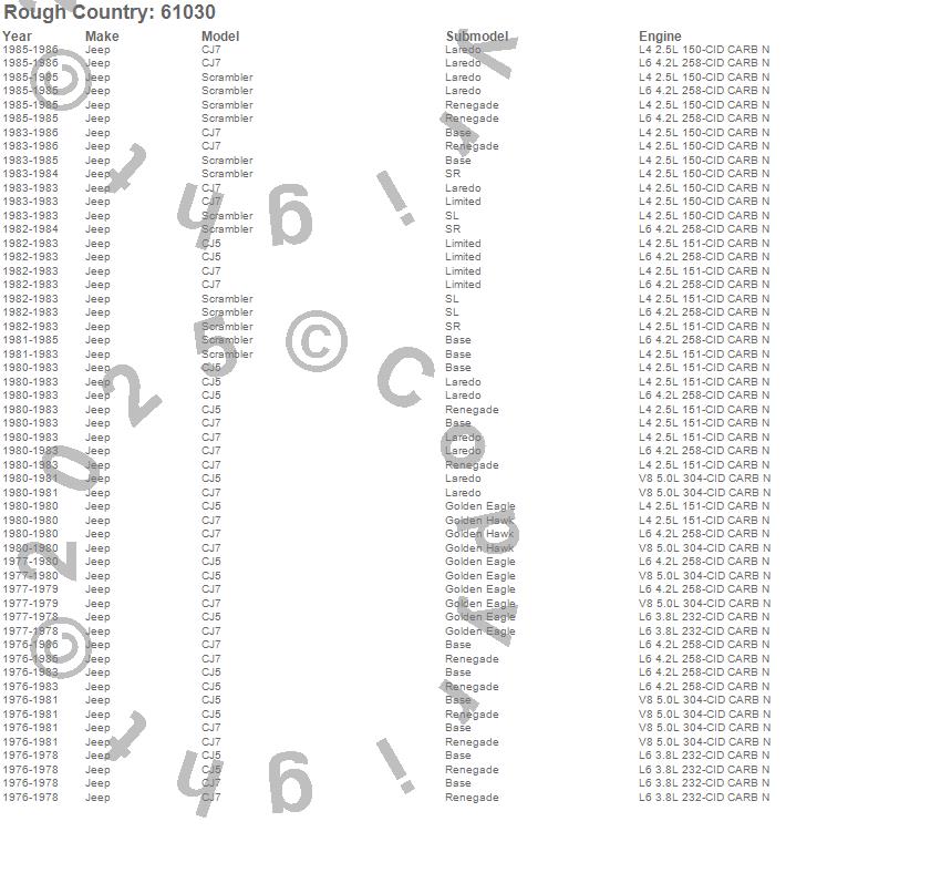 Below is an abbreviated list of applications for the Suspension Lift Kit w/Shocks.CJ5, CJ7, Scrambler, Jeep, 1986, 1985, 1984, 1983, 1982, 1981, 1980, 1979, 1978, 1977, 1976