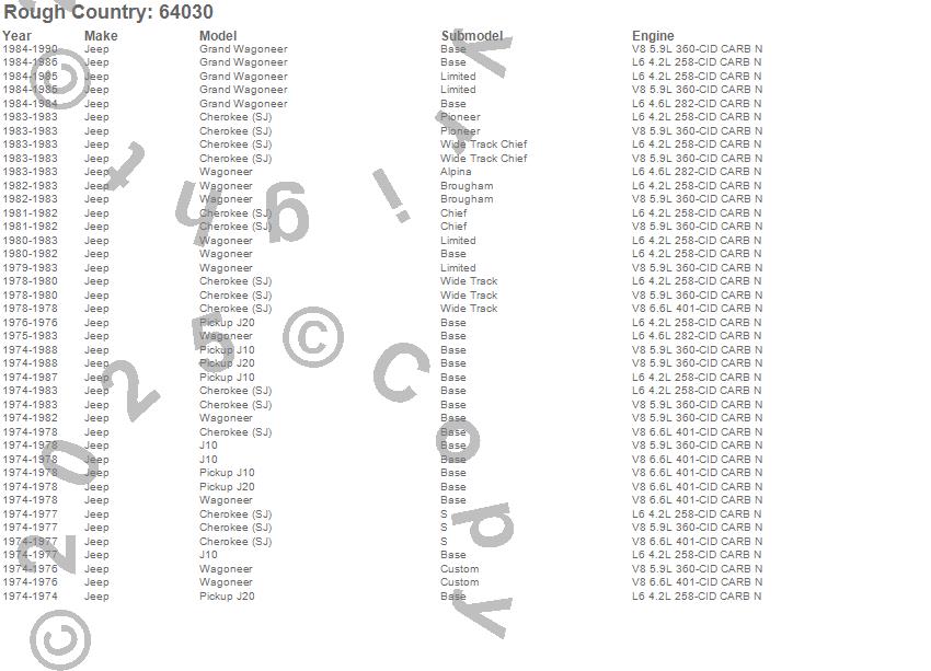 Below is an abbreviated list of applications for the Suspension Lift Kit w/Shocks.Cherokee (SJ), Grand Wagoneer, J10, J20, Wagoneer, Jeep, 1990, 1989, 1988, 1987, 1986, 1985, 1984, 1983, 1982, 1981, 1980, 1979, 1978, 1977