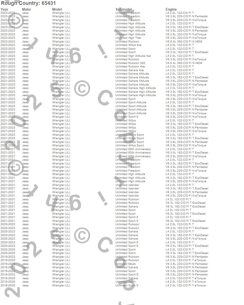Below is an abbreviated list of applications for the Suspension Lift Kit w/Shocks.Wrangler (JL), Jeep, 2023, 2022, 2021, 2020, 2019, 2018