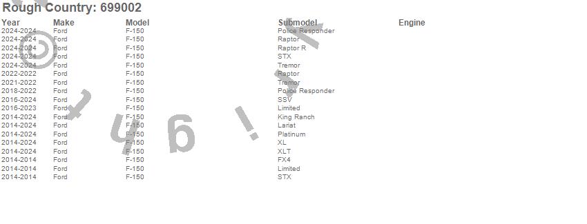 Brand: Rough CountryPart Number: 699002Shock Absorber Kit Type: Adjustable - For Rear Left and Right w/4-6.5 in. Lifts - Incl. Reservoir Mounting Plates - Stainless Steel ClampsUPC: 843030147242