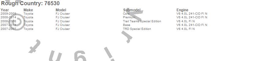 Below is an abbreviated list of applications for the Suspension Lift Kit w/Shocks.FJ Cruiser, Toyota, 2014, 2013, 2012, 2011, 2010, 2009, 2008, 2007