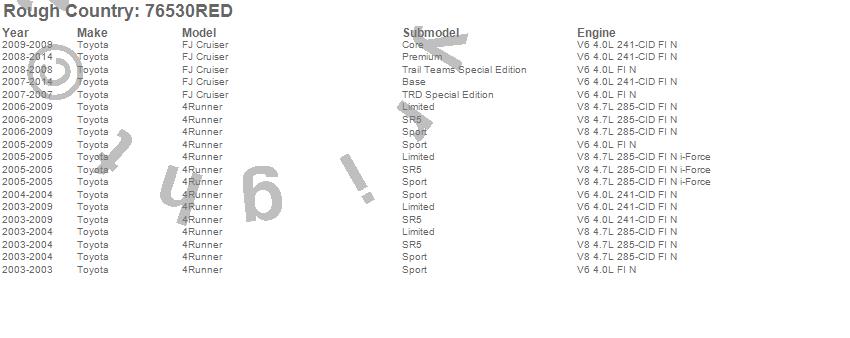 Below is an abbreviated list of applications for the Suspension Lift Kit w/Shocks.4Runner, FJ Cruiser, Toyota, 2014, 2013, 2012, 2011, 2010, 2009, 2008, 2007, 2006, 2005, 2004, 2003