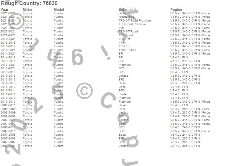 Below is an abbreviated list of applications for the Bolt-On Lift Kit w/Shocks.Tundra, Toyota, 2021, 2020, 2019, 2018, 2017, 2016, 2015, 2014, 2013, 2012, 2011, 2010, 2009, 2008, 2007