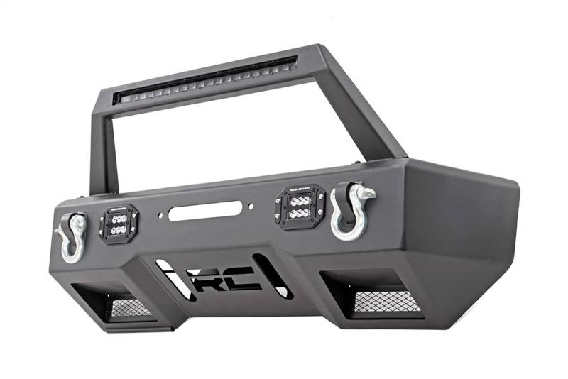 Buy this Front Stealth Stubby Winch Bumper Rough Country 11826 Incl. Hoop - Two 2 in. LED Cube Lights - D-Rings - Light Bar Hoop - Black Series 20 in. LED Light Bar - Satin Black here at SVCustoms.com an authorized Rough Country Bumper- Front dealer and distributor.