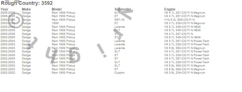 Below is an abbreviated list of applications for the Front Leveling Kit.1500, Ram 1500, Dodge, 2005, 2004, 2003, 2002