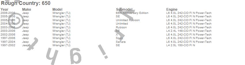 Below is an abbreviated list of applications for the Suspension Lift Kit.Wrangler (TJ), Jeep, 2006, 2005, 2004, 2003, 2002, 2001, 2000, 1999, 1998, 1997