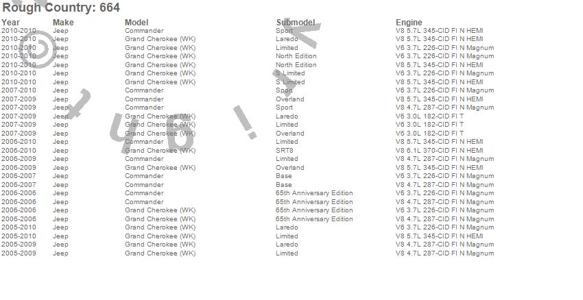 Below is an abbreviated list of applications for the Suspension Lift Kit.Commander, Grand Cherokee (WK), Jeep, 2010, 2009, 2008, 2007, 2006, 2005