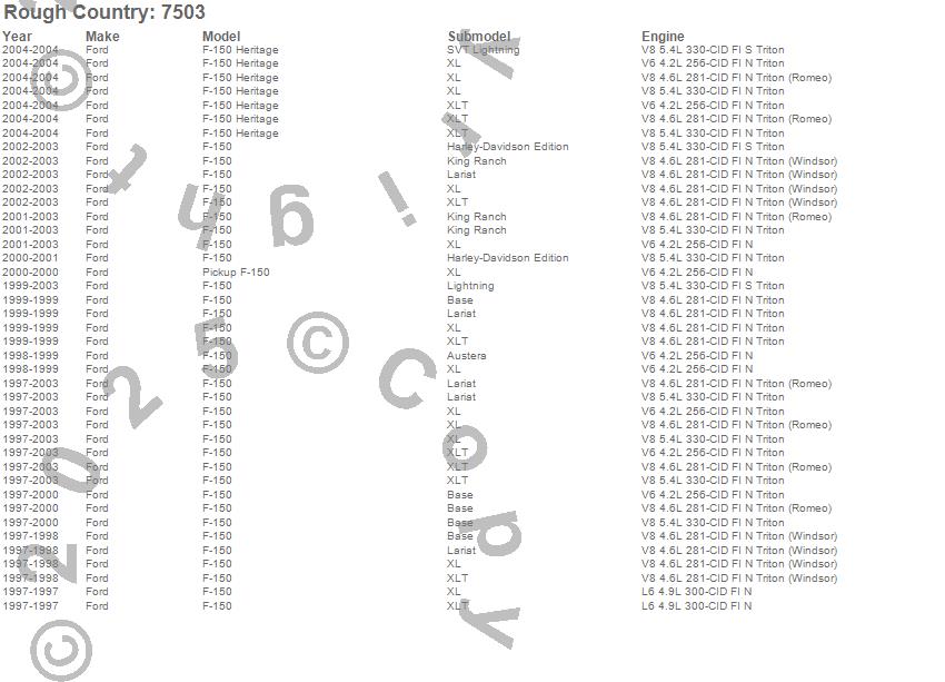 Below is an abbreviated list of applications for the Front Leveling Kit.F-150, F-150 Heritage, Ford, 2004, 2003, 2002, 2001, 2000, 1999, 1998, 1997
