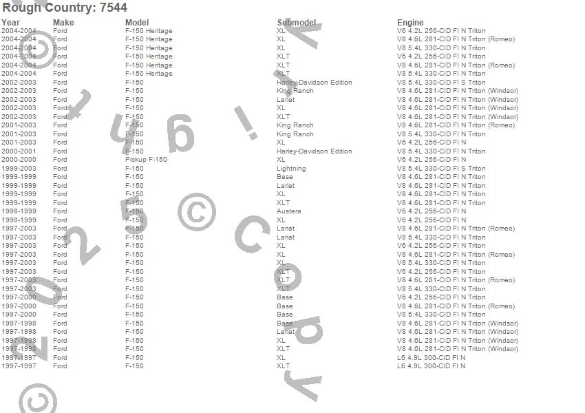 Below is an abbreviated list of applications for the Front Leveling Kit.F-150, F-150 Heritage, Ford, 2004, 2003, 2002, 2001, 2000, 1999, 1998, 1997