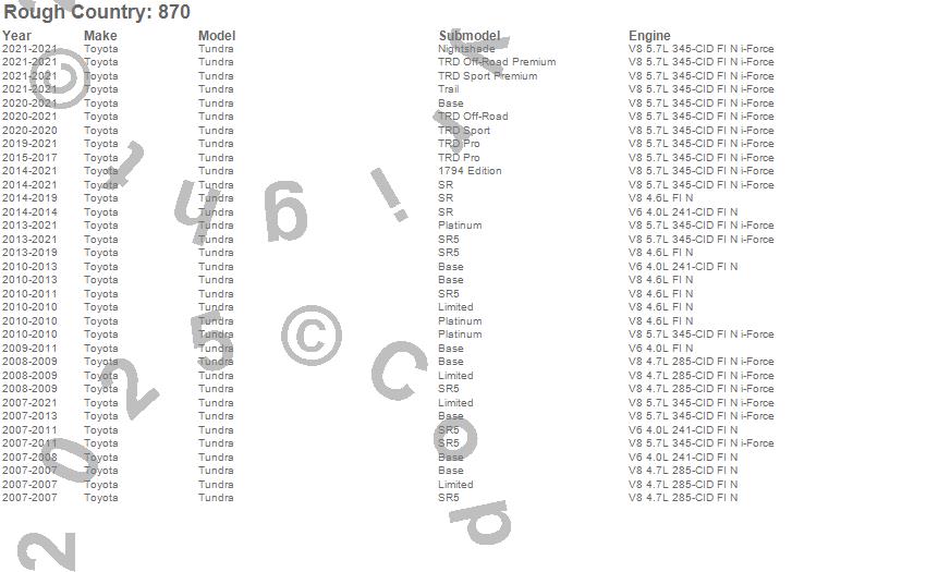 Below is an abbreviated list of applications for the Front Leveling Kit.Tundra, Toyota, 2021, 2020, 2019, 2018, 2017, 2016, 2015, 2014, 2013, 2012, 2011, 2010, 2009, 2008, 2007