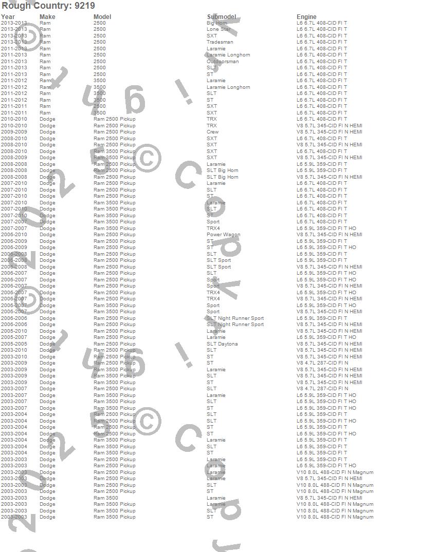 Below is an abbreviated list of applications for the Front Leveling Kit.2500, 3500, Ram 2500, Ram 3500, Dodge, Ram, 2013, 2012, 2011, 2010, 2009, 2008, 2007, 2006, 2005, 2004, 2003