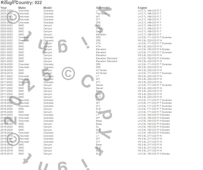 Below is an abbreviated list of applications for the Front Leveling Kit.Canyon, Colorado, Chevrolet, GMC, 2023, 2022, 2021, 2020, 2019, 2018, 2017, 2016, 2015