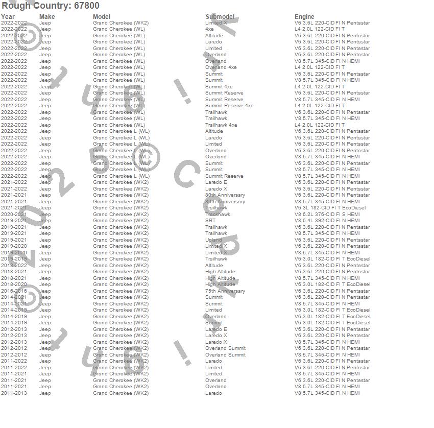 Below is an abbreviated list of applications for the Front Leveling Kit.Grand Cherokee (WK2), Grand Cherokee (WL), Grand Cherokee L (WL), Jeep, 2022, 2021, 2020, 2019, 2018, 2017, 2016, 2015, 2014, 2013, 2012, 2011