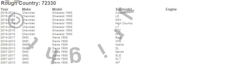 Below is an abbreviated list of applications for the Coil Spring Lowering Kit.Sierra 1500, Silverado 1500, Chevrolet, GMC, 2018, 2017, 2016, 2015, 2014, 2013, 2012, 2011, 2010, 2009, 2008, 2007