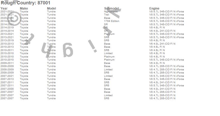 Below is an abbreviated list of applications for the Suspension Leveling Lift Kit.Tundra, Toyota, 2021, 2020, 2019, 2018, 2017, 2016, 2015, 2014, 2013, 2012, 2011, 2010, 2009, 2008, 2007
