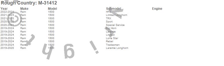Brand: Rough CountryPart Number: M-31412Floor Mat Set Type: Front and Rear - Full ConsoleUPC: 843030150013