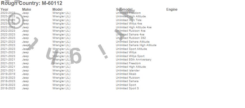 Brand: Rough CountryPart Number: M-60112Floor Mat Set Type: Front and RearUPC: 843030138004