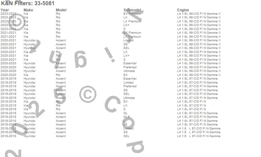 Below is an abbreviated list of applications for the Air Filter.Accent, Rio, Hyundai, Kia, 2019, 2018