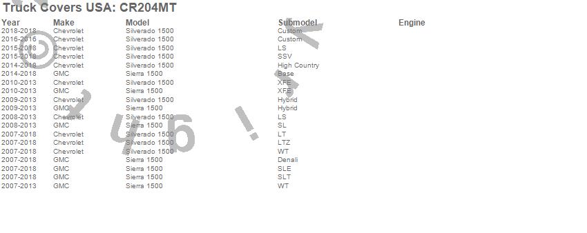 Below is an abbreviated list of applications for the American Roll Cover.Sierra 1500, Silverado 1500, Chevrolet, GMC, 2018, 2017, 2016, 2015, 2014, 2013, 2012, 2011, 2010, 2009, 2008, 2007
