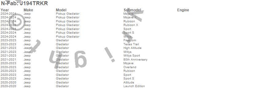 Below is an abbreviated list of applications for the RKR Rock Rails Cab Length.Gladiator, Pickup Gladiator, Jeep, 2025, 2024, 2023, 2022, 2021, 2020