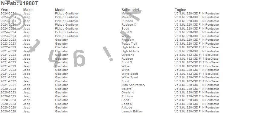 Below is an abbreviated list of applications for the Wheel To Wheel Nerf Step Bar.Gladiator, Pickup Gladiator, Jeep, 2025, 2024, 2023, 2022, 2021, 2020