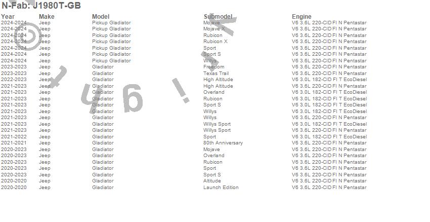 Below is an abbreviated list of applications for the Wheel To Wheel Nerf Step Bar.Gladiator, Pickup Gladiator, Jeep, 2025, 2024, 2023, 2022, 2021, 2020
