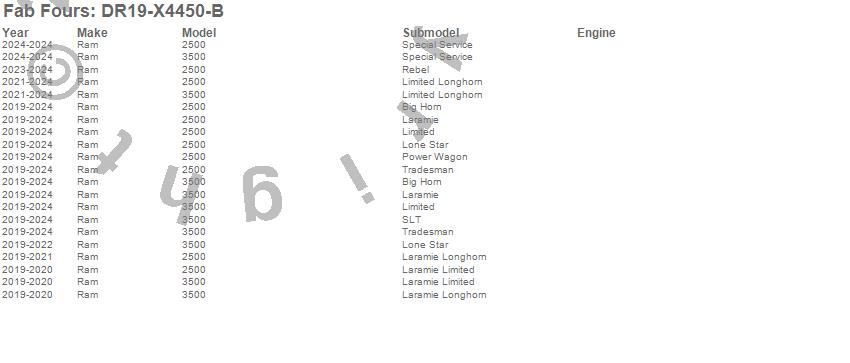 Brand: Fab FoursPart Number: DR19-X4450-BBumper- Front Type: w/Full Guard - Bare - Plate SteelUPC: 005810119287