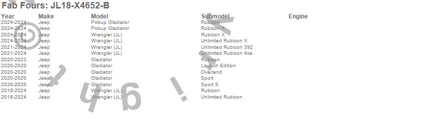 Brand: Fab FoursPart Number: JL18-X4652-BBumper- Front Type: w/Pre-Runner - Bare - Plate SteelUPC: 005810119461