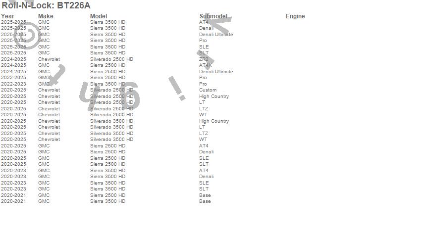 Below is an abbreviated list of applications for the Roll-N-Lock A-Series Truck Bed Cover.Sierra 2500 HD, Sierra 3500 HD, Silverado 2500 HD, Silverado 3500 HD, Chevrolet, GMC, 2025, 2024, 2023, 2022, 2021, 2020