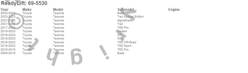 Below is an abbreviated list of applications for the SST Lift Kit.Tacoma, Toyota, 2023, 2022, 2021, 2020, 2019, 2018, 2017, 2016, 2015, 2014, 2013, 2012, 2011, 2010, 2009, 2008, 2007, 2006