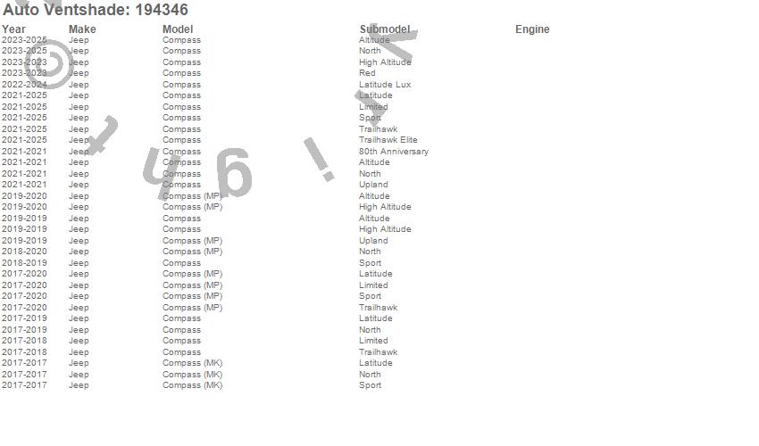 Below is an abbreviated list of applications for the Ventvisor In-Channel Deflector 4 pc..Compass, Jeep, 2025, 2024, 2023, 2022, 2021, 2020, 2019, 2018, 2017